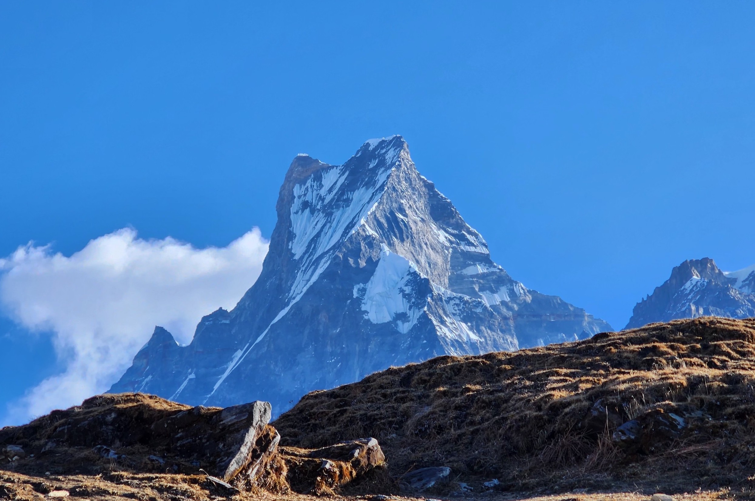 We reach the viewpoint afterward from where we can see the Machhapuchhre and Annapurna Range so close to us. We capture some moments with these majestic mountains and head back shortly afterward. Mardi Himal Trek is well known for its pristine location, considered one of Nepal's best ones. We get to experience the great adventure and thrill of this wonderful trek to Mardi Himal. We descend through the alpine forest full of beautiful white and red rhododendrons passing through different villages enriched with diverse ethnicities trailing through the rocky and steep landscapes.